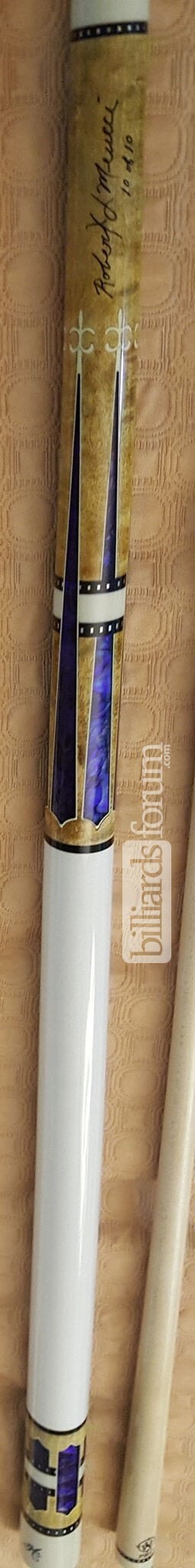 Bob Meucci Custom Purple Pearl Knight pool cue forearm is made from Birdseye maple and is signed in black by Robert "Bob" Meucci. The forearm is inlaid with six authentic purple pearl points framed in white. In the center of the forearm and laced between the six points is an ivory colored ring outlined with a black stitched collar. The butt sleeve consists of a six purple pearl floating window inlays framed in white with an ivory-colored ring outlined with a black stitched collar matching the forearm. Completing the cue is a urethane-coated white Irish linen wrap and a Meucci "The Pro" 12.75mm Shaft.
