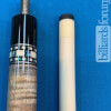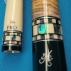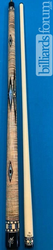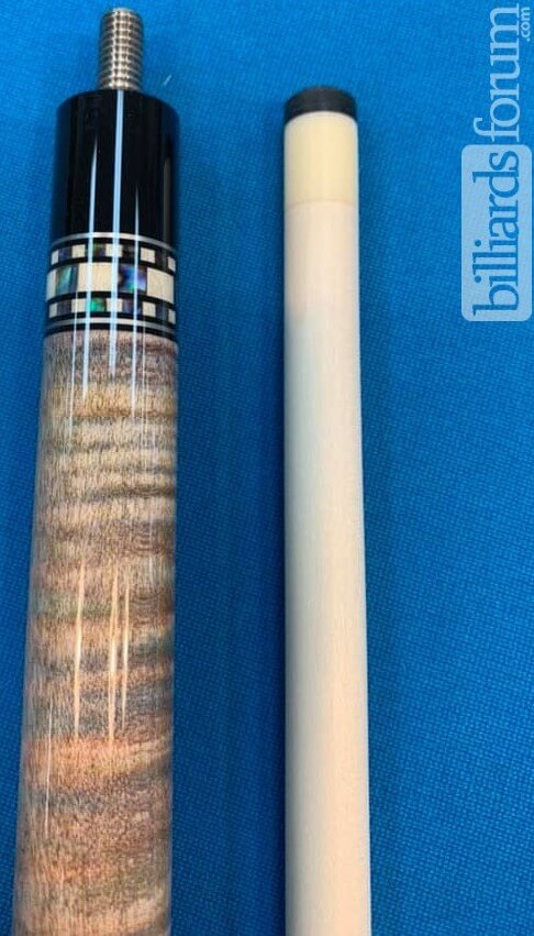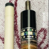 | Forearm: | The cue features a highly-figured rainbow-stained curly maple forearm. It contains inlays of several small abalone diamonds with a double border made from white and black composite material. The forearm is bordered by a larger inlaid abalone diamond near the handle, and matching ringwork near the joint collar. |