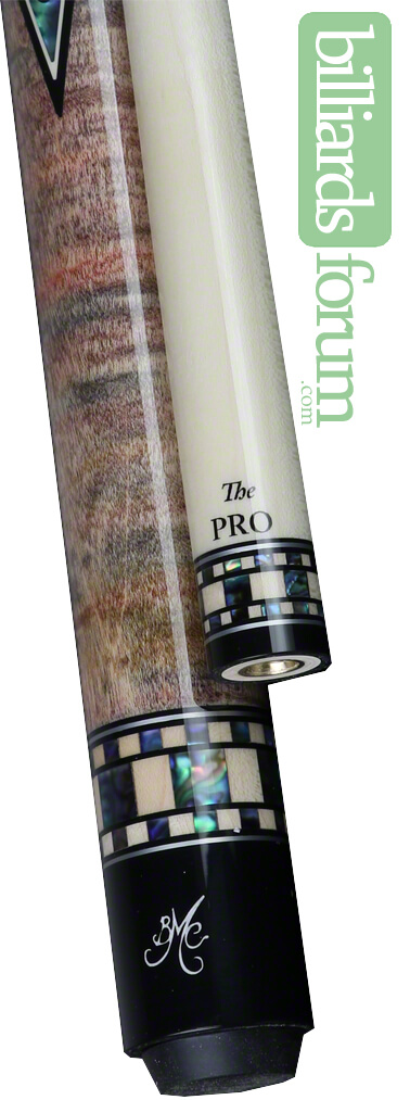 Photo of a buttsleeve from a grey-stained BMC abalone Mini Diamond cue with matching Meucci "The Pro" shaft.