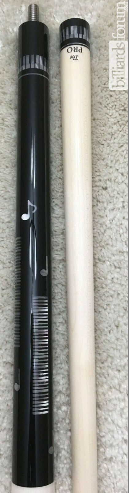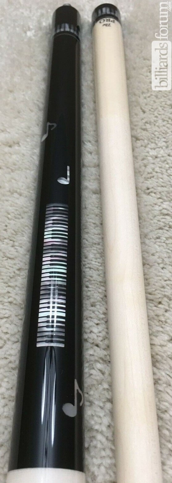 New Meucci "Pearl Piano Cue" with a Meucci "The PRO" shaft. It has a flat-faced joint with a 5/16x18 pin. The forearm and butt sleeve are black with pearl inlays. The cue has Meucci's five-proof urethane coating, including the wrap area, and a classic push-in rubber bumper. The cues comes standard set to 19 oz. I can adjust the weight to your liking anywhere between 18 oz and 21 oz prior to shipment.