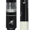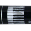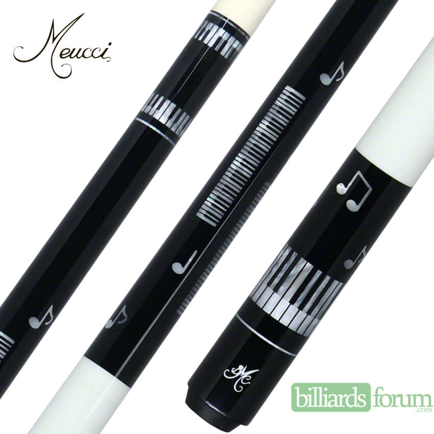The Meucci BMC Pearl Piano Pro cue has a black forearm with four white pearl piano key inlays offset around the forearm with white pearl musical notes dancing around the forearm. The butt sleeve is black with a white pearl inlay design wrapped around the base of the butt cap with more musical notes that match the forearm. This cue's special features include a black butt cap and joint collar with white pearl piano ring work. Completing the cue is a urethane-coated white Irish linen wrap and Meucci "The Pro" shaft.