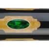 | Forearm: | Black plastic and Birdseye maple with 4 antique-stained points encased in black, green, and orange veneers. In this custom version, the wide base of the points have oval paua shell emerald inlays. |