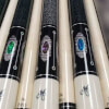 A picture of pool cues from the BMC Skyler Woodward Barbox series line of pool cues by Bob Meucci Customs. It can be used to identify BMC Skyler Woodward Barbox Series Cues and find out how much BMC Skyler Woodward Barbox Series pool cues are worth.