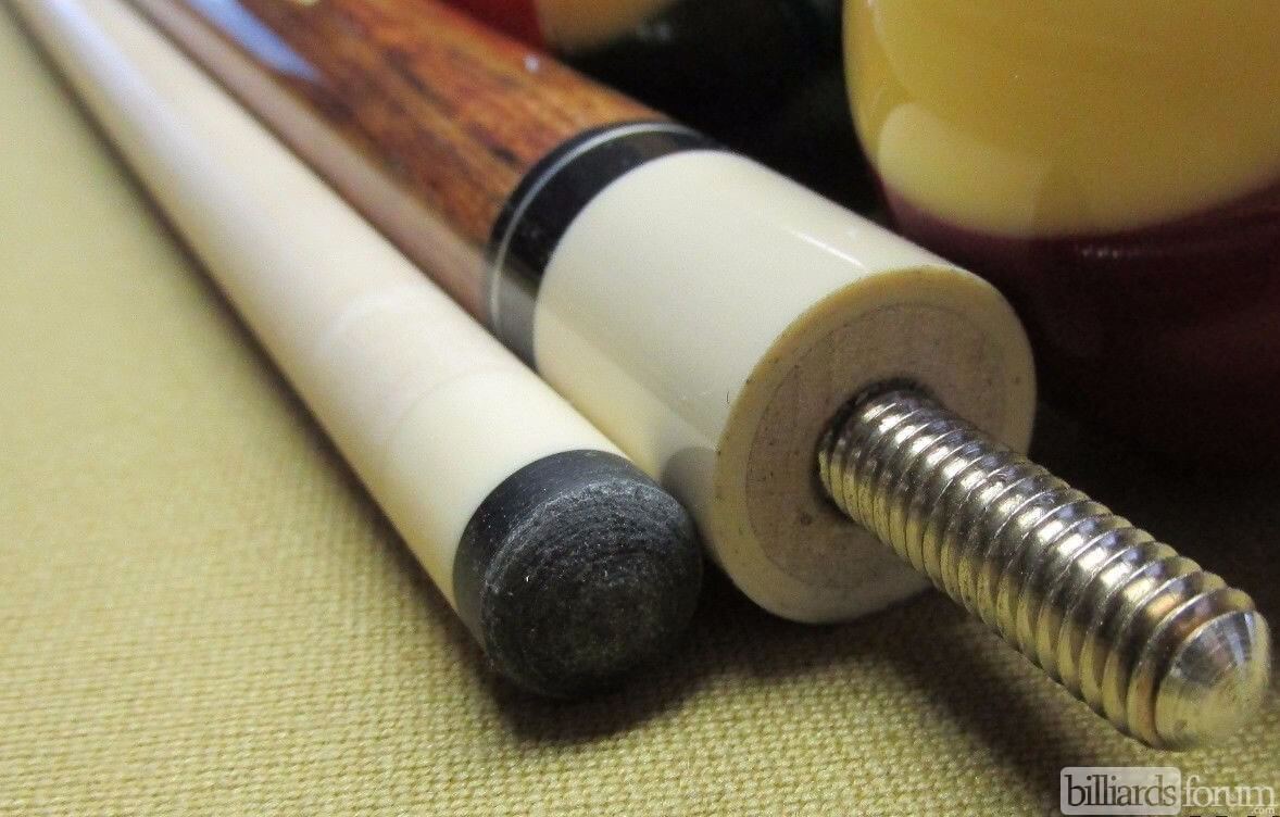 Photo of a BMC SWBB 3 pool cue. Shown here is a close-up of the joint and cue-tip.