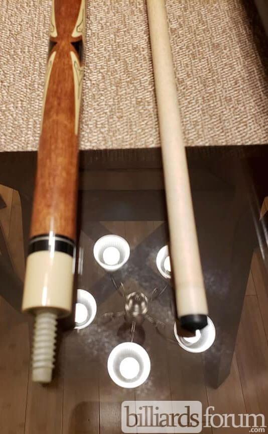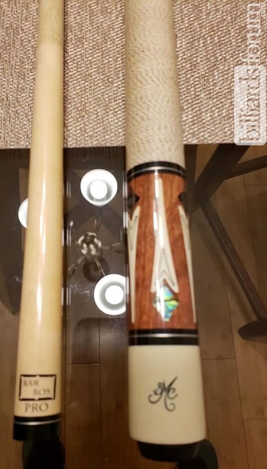 Photo of a BMC SWBB 3 cue with a G10 pin and a Meucci Bar Box Pro shaft.