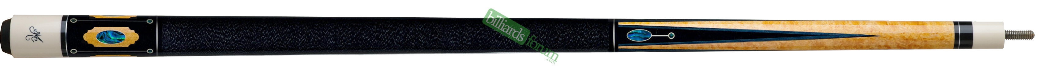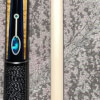 | Butt Sleeve: | The cue features an ebony butt sleeve. The ebony background contains two natural-stained maple inlays positioned opposite to each other. Inside of those is an oval-shaped blue abalone inlay outlined in an ivory-colored border. Separating the two maple inlays are sliver lines, which are book-ended with blue abalone circles. |
