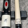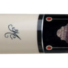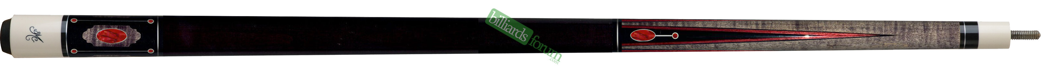 | Butt Sleeve: | The cue features an ebony butt sleeve. The ebony background contains two grey-stained maple inlays positioned opposite to each other. Inside of those is an oval-shaped red shell inlay outlined in an ivory-colored border. Separating the two maple inlays are sliver lines, which are book-ended with red shell circles. |