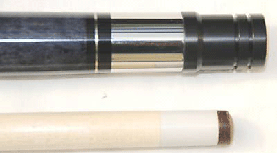 After digging into our data base, I believe this was a cue that was either sold as a unique piece or used for sponsorship purposes. I do not have much information for this cue but it was set to retail between USD $350.00 to USD $400.00. It is constructed with Canadian first grade Birdseye stained grey, ebony, bone and shell inlays, real nickel silver rings, hand polished stainless steel joint, 5/16 14 thread standard joint pin, hand wrapped and pressed genuine Irish linen wrap. Shaft is Canadian number 1 white first grade maple with Triangle tip and phenolic ferrule.