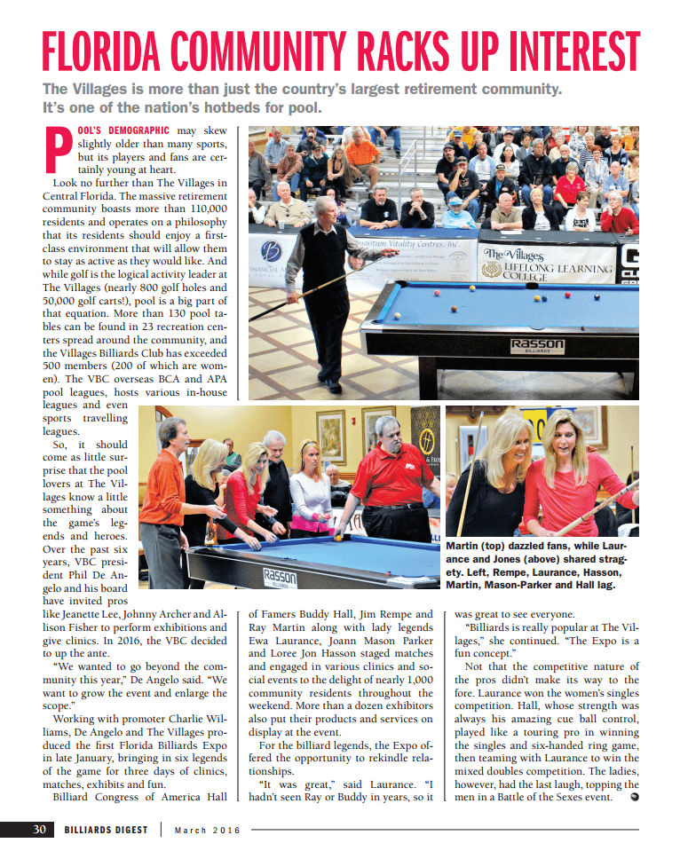 billiardsforum on 1/9/2017 1:56:26 PM"The Villages" is a very well known and large retirement community in Florida, and across it's various recreation centers, I think it has over 60 pool tables. It is known as "a hotbed of billiard activity" by many in the cue sport industry.