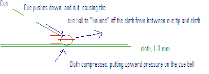 billiardsforum on 4/18/2008 1:09:25 PMI believe the essence of the true jump shot is the angle and swiftness of the stroke. Back hand up high, cue tip aimed just above the equator of the cue ball, and a nice quick stiff shot. This "jams" the cue ball down into the cloth. (versus the scoop under and lift) This compresses the cloth, and "squeezes" the cue ball outward (and hopefully upward) from out of the grip of the cue tip (top) and cloth. (bottom)