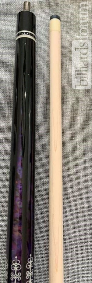 Photo of a black and purple Meucci 21-3C cue.