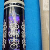 Close-up of a black and purple Meucci 21-3C butt sleeve. It features purple paua shell inlays instead of the standard blue ones typically found in the 21-3 cue model.