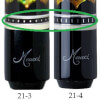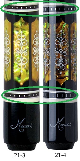 The black Meucci 21-3C yellow cue looks very much similar to the Meucci 21-4 cue, but it differs slightly in the ringwork inlays. The 21-4 cue has rectangular silver inlays while the 21-3C's inlaid silver squares are perfectly square: