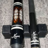 A black Meucci 21-3 cue with yellow paua shell inlay that was "razzled" by pro pool player Sky Woodward in Feb 2021.