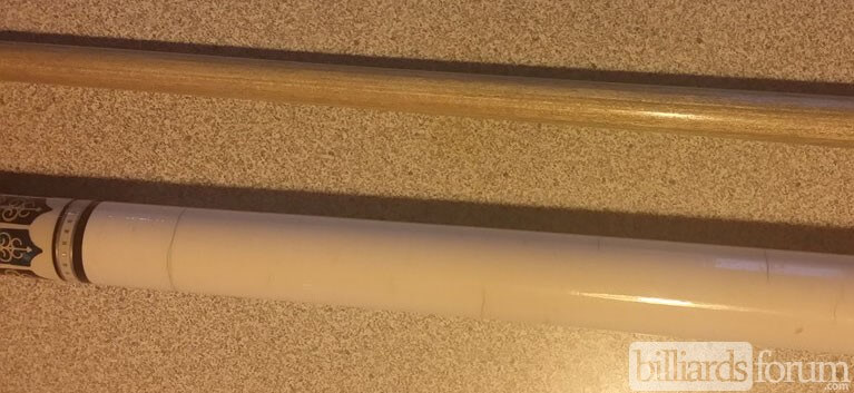 Photo of a Meucci 21-3 pool cue that was repaired by Scott Erwin and being offered for sale for $500. It is not selling at this price (trying for a few months) and probably won't sell at this price since you can get it new for another $200.