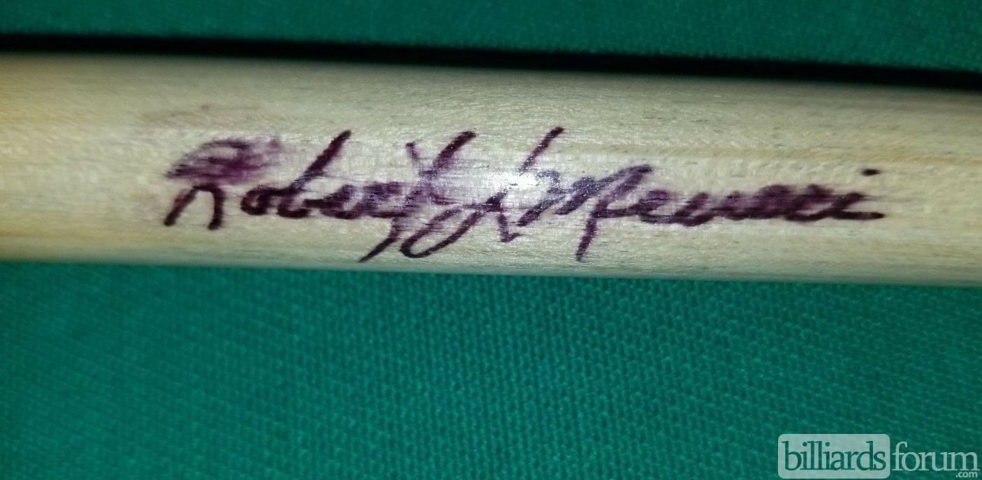 Photo of a Meucci 21-3 pool cue with Bob Meucci's signature.