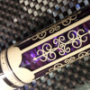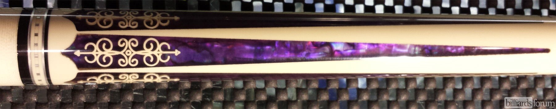 Photo of the forearm of a Meucci 21-3 purple edition pool cue. #7 of 15 total cues made. This version features purple paua shell inlays instead of blue.