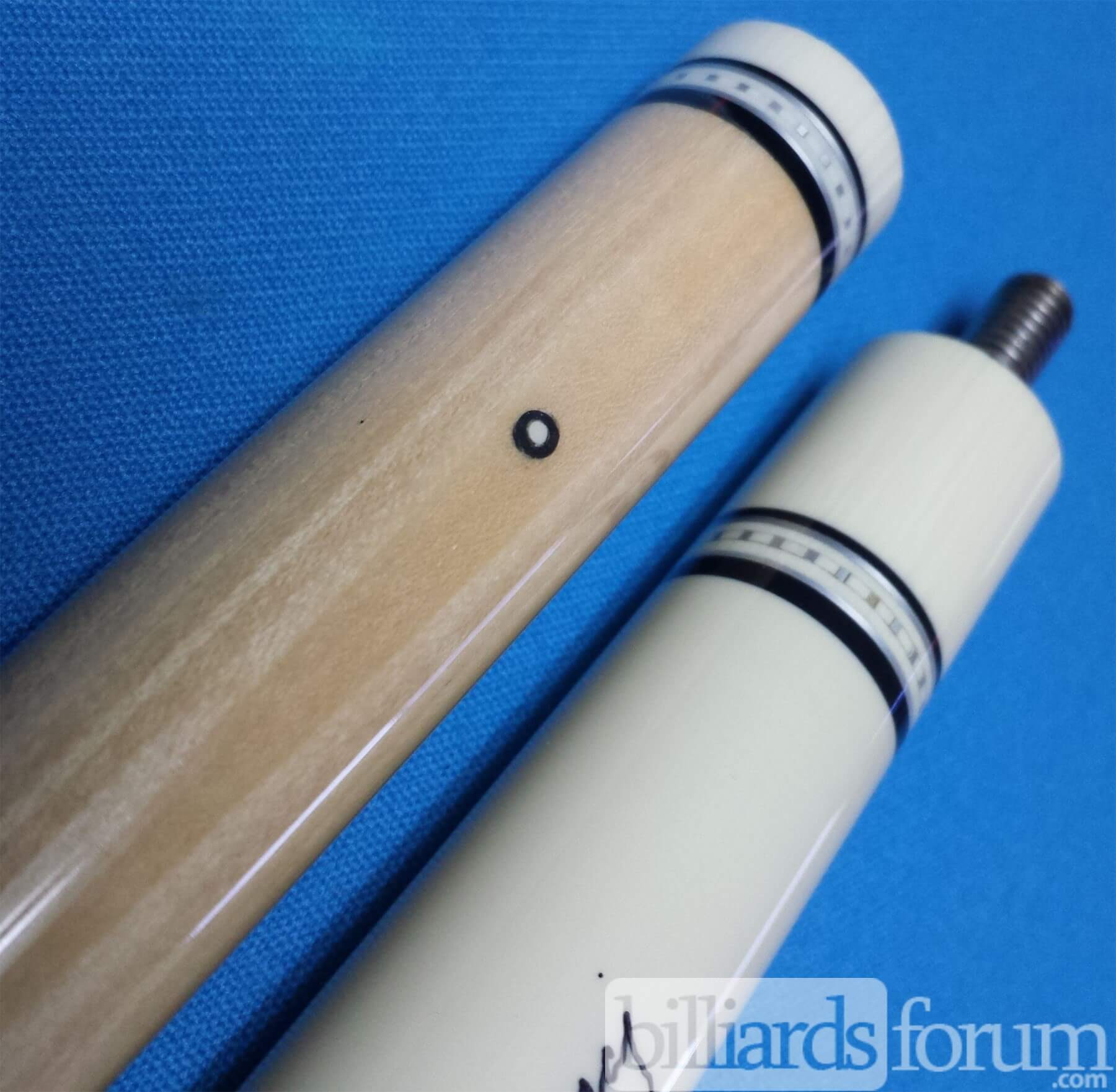 This Meucci 21-3P Purple cue stick is the same as a regular 21-3 but is numbered and signed by Bob, and has purple inlays instead of blue.