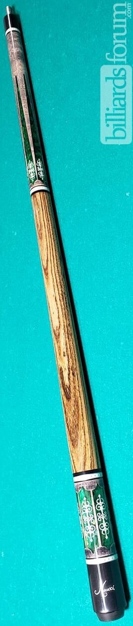 Meucci 21-3 cue variation. This one has a grey-stained birdseye maple butt sleeve and forearm with green inlays.