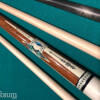 | Rings: | This Meucci 21-6 cue features the standard ringwork consisting of 24 green veneer inlays at the joint surrounded by ivory, black, and aluminum rings. In addition to this, three more instances of the same rings exist at each end of the wrap (at the top of the butt-sleeve and the bottom of the forearm) as well as near the butt cap. This is the main customization for this particular custom 21-6 cue. |