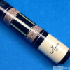 Photo of a Meucci JS 1 pool cue showing a close-up of the veneer work and ring work in the butt sleeve.