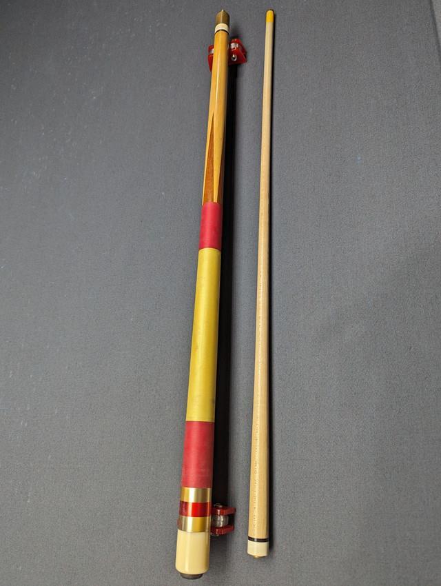 A fine, inexpensive cue featuring inlaid four-prong construction, hand fitted polished brass joint with black and white collars,dacron wrapping in your choice of 10 colors or color combinations, professional taper shaft with either screw on or permanent type ferrule fitted with either Champion or Blue Diamond tips.