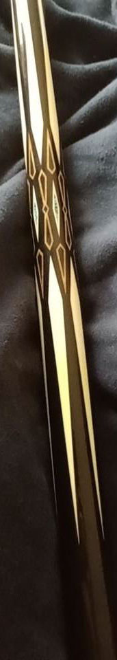 This cue has an ebony-stained maple butt with imitation ivory floating points moving in both directions from the center of the design. This cue is unwrapped, allowing the design to fully capture the eye on this unique pool cue. There are also silver rings on either side of the butt.