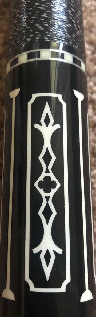 I am trying to identify a pool cue with the letters "Vj" on the forearm.