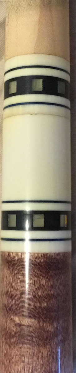 I definitely bought my cue in the late 1980s. I believe my cue may have been swapped one night at a bar tournament. A fellow was very interested to buy it for his collection. He told me this same design was made in the 1970s, 1980s, and 1990s. He needed the version from the 1980s for his collection. The butt cap is under .75 inches, and the weight screw has a flat-head.