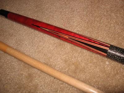 Here is a perfect example of a cue which is in mint, virtually flawless condition, made for Brunswick by Falcon, from what is believed to be late 80's to early/mid 90's era. Based on similar cues of this detail offered around that time, retailed for up to 1000. This particular design has yet to be identified exactly by anyone I've contacted. Believed to be very unique and rare. The details: 4 ebony points, 4 veneers, natural/red/natural/black. Cherry stained birdseye forearm. Ebony buttsleeve, 4 Ivory razor shaped windows with 1 MOP diamond in each, w/ red stitched rings above and below. Original "Made in Canada" sticker still intact. 5/16x14 piloted joint. Solid black collars, 1 original shaft w/ Meucci like 1 1/4" ferrule. 12.75mm at tip. Yes, it rolls good! Best example of a highly pressed and polished Black/w white spec Irish linen wrap I've seen. Tip has been chalked, but the cue has seen no real play time. Included is an unknown USA made, check the tag, vintage to be sure, heavy 1x1 box case w/ small storage area. Here's your chance to add a cue to your Brunswick collection that most have never seen.