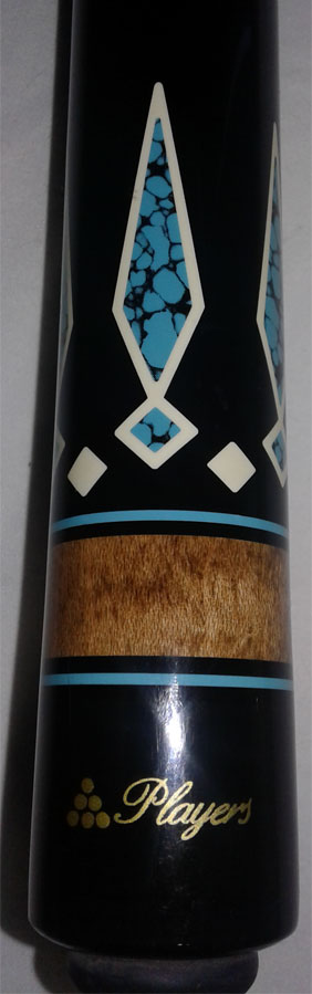 Players pool cue with a natural stained maple forearm with a black stained maple handle with fifteen floating turquoise spear design. The joint is stainless steel with 5/16 x 18 pin with two sets of nickel silver rings. This pool cue comes with one shaft with a 13mm pro taper and a Le Pro leather tip.