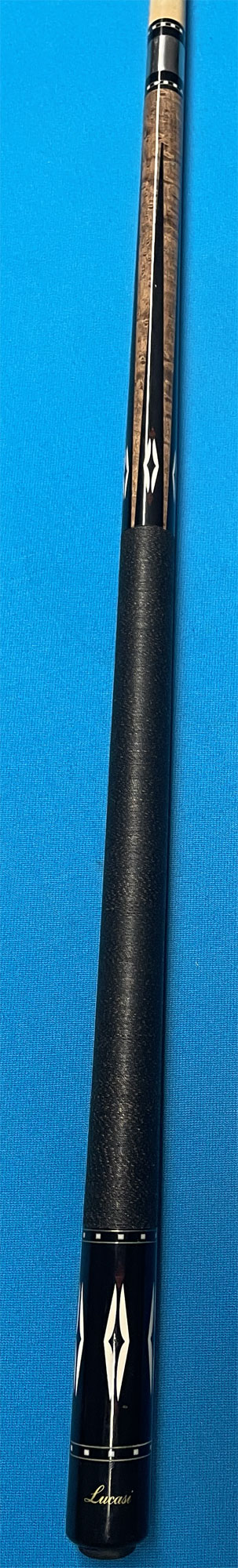 Lucasi pool cue with a birdseye maple forearm with five ebony points with bone ivory and tulipwood inlays. The butt is ebony with tulipwood and bone ivory inlays. There are two sets of ebony and bone ivory rings surrounded by nickel silver. The wrap is black with white spec irish linen. The joint is stainless steel with the Uniloc joint with two sets of Bushka style rings. This pool cue comes with one shaft with a 13mm pro taper and a Le Pro leather tip.