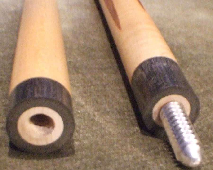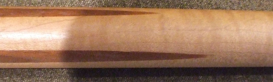 The points are off, in other words they were made crooked and/or the cue was turned crooked. The checkered inlays are off as well.