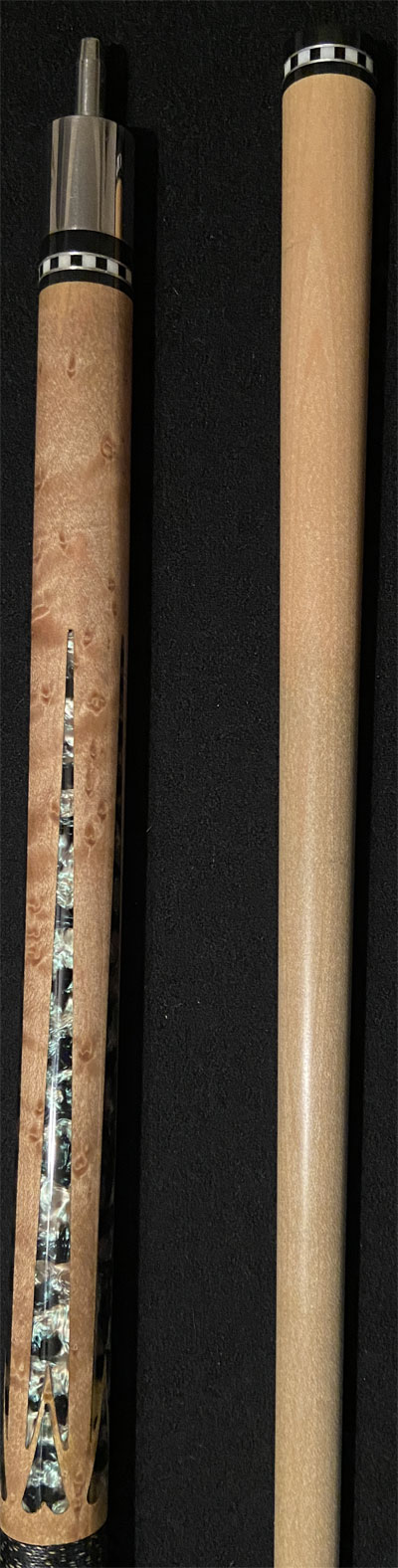 There aren’t any markings or logos on the cue that I can see. The inlay looks like abalone shell.