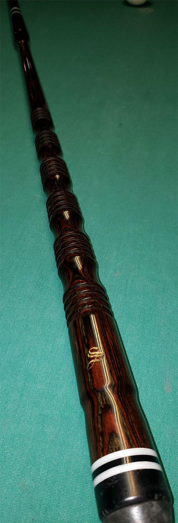 There's also "Bob Cue" by (late) California cue maker Bob Renis, but again, I still don't think that's it because I've never seen one with a "S" on it, but I thought of it because of the similarities in the rings and handle design between yours and some Bob Cues: