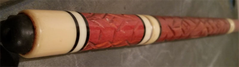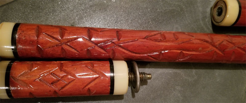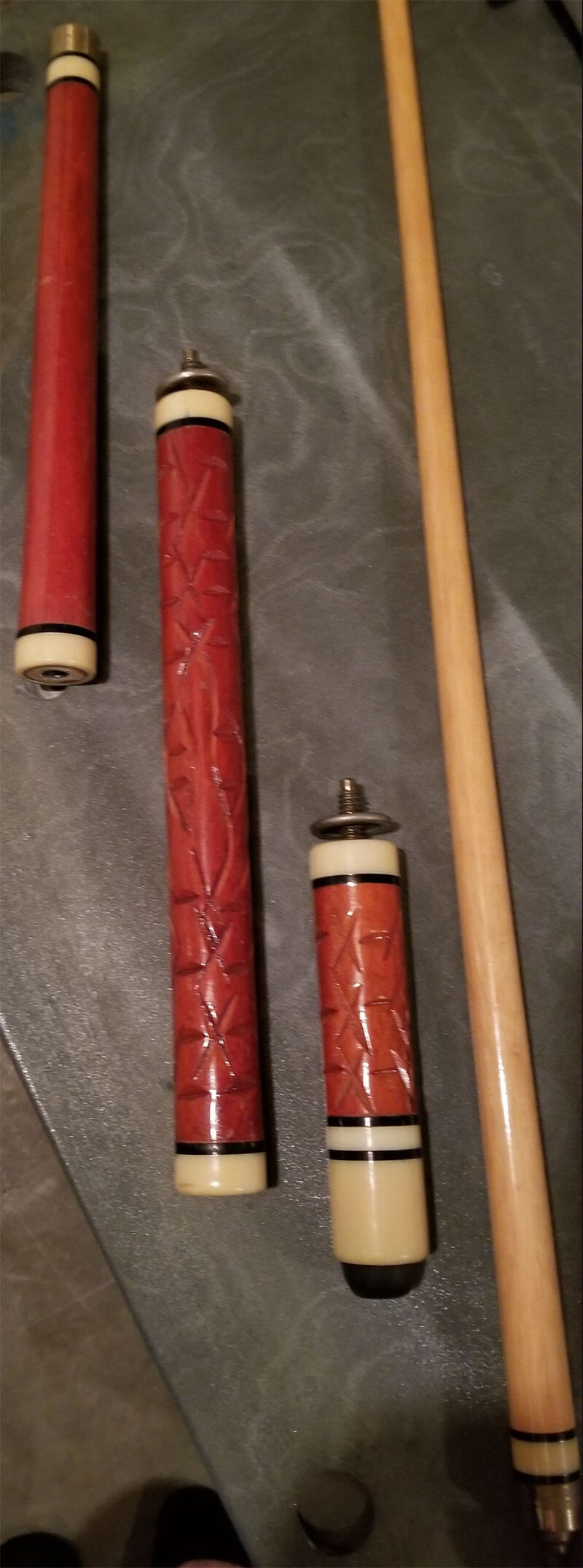 I need help identifying the 4-piece carved pool cue in the attached photos.