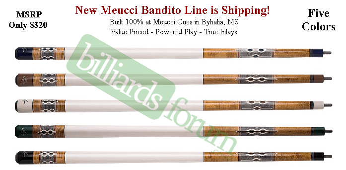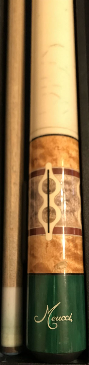 billiardsforum on 11/18/2019 4:25:36 PMThis cue is a Meucci "Bandito Green" cue, from the Meucci Bandito series circa 2007.