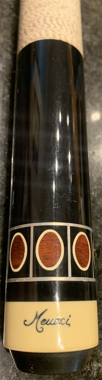 Meucci pool cue with a stained birdseye maple forearm with four ebony points with two veneers and blood wood ovals surrounded by ivorine in the points. The butt is ebony with blood wood ovals inside of ebony boxes. There are two sets of thick blood wood rings. The wrap is white with brown spec Irish linen coated in lacquer. The joint is stainless steel with a 5/16 x 18 piloted stainless steel pin. This pool cue comes with your choice of red dot or black dot shaft.