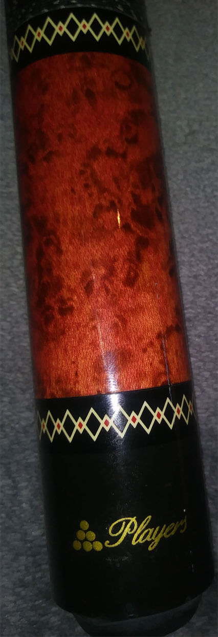 Players pool cue with a red stained birdseye maple forearm. The butt is red stained birdseye maple. The wrap is black with white spec Irish linen. There are five sets of beautiful rings. The joint is stainless steel with a 5/16 x 18 pin. This pool cue comes with one shaft with a 13 mm pro taper and a Le Pro leather tip.