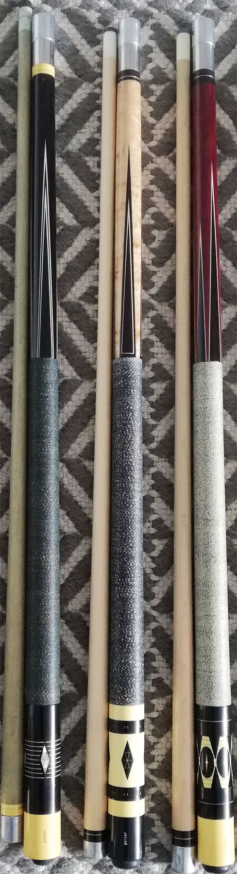 I need some help to identify 3 "porper" pool cues that I found in my basement. I don't play pool so might sell them, but I need to know how much they are worth.