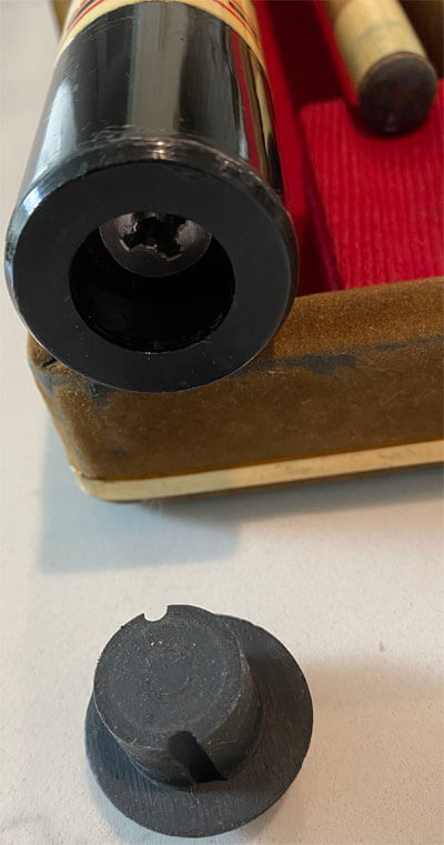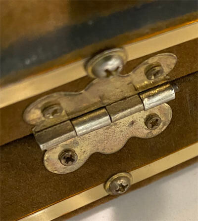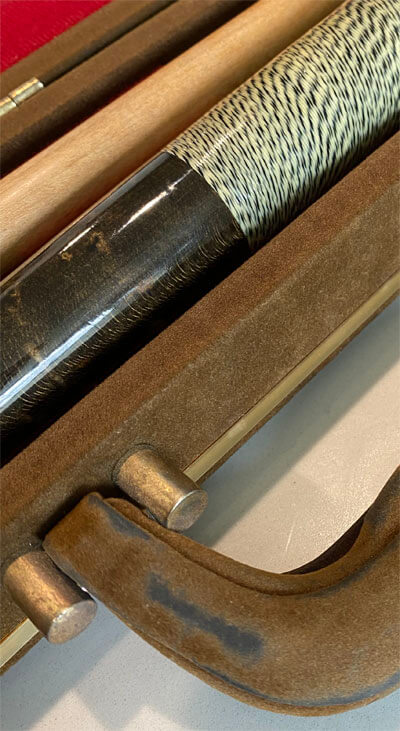 It came in this beautiful worn suede cue case with brass borders, hinges, and closures.