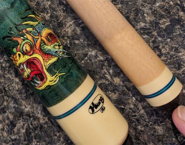 VIDK07 - Stay out of the dungeon with the help of this dragon cue! The bird's-eye maple forearm of this cue features a ferocious-looking Chinese-esque dragon. The bird's-eye maple butt sleeve is adorned with two equally intense-looking dragons. Get medieval on your opponents!