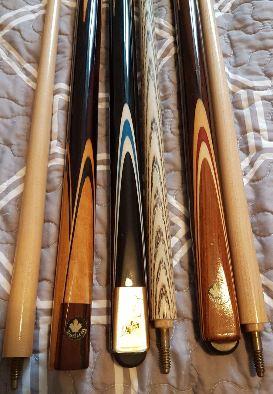 There are still a lot of vintage Dufferin cues for sale in Ontario. Lots of red leaf Dufferin cues especially. Silver leaf ones seem pretty rare. I've not seen green leaf Dufferins turn up to much either. Most people that sell old pool tables online in Ontario have old Dufferin cues with it that they will part with separately.