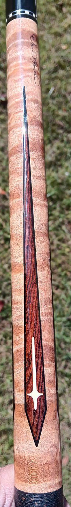 Lucasi pool cue with a birdseye maple forearm with four cocobolo floating points with an ebony outline and ivorine inlays. The butt is ebony with ivorine inlays surrounded by cocobolo ovals. This cue features two sets of bushka style ring and three sets of maple rings. The joint is phenolic with the uniloc joint. This pool cue comes with one shaft with a 13mm pro taper.