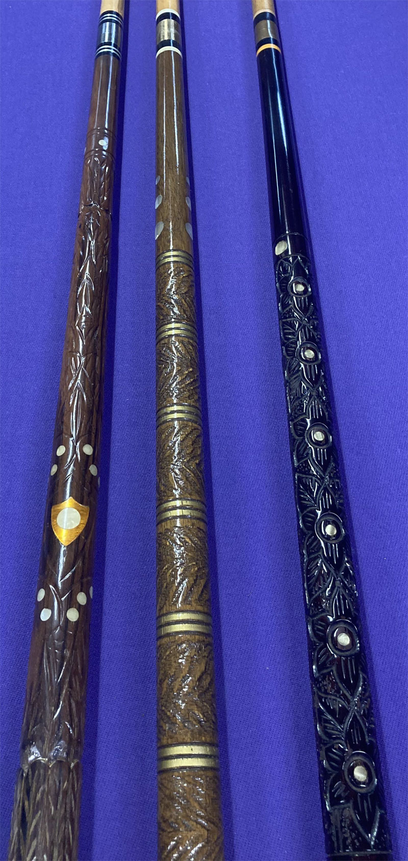 They're most likely inexpensive import cues of little to no value as a collectible cue. One of the cues even has the production stickers showing the weight and the model name. This type of carved wood pool cues with those particular stickers are typically indicative of low-quality import cues.