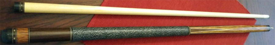 J&J pool cue with a bacote forearm with four sharp ebony points with two veneers. The butt is ebony with a bacote bottom. There are six sets of rings. The wrap is black with white spec Irish linen. This cue comes with one shaft with a 13 mm pro taper. The joint is a 3/8 x 12 flat faced wood to wood joint.