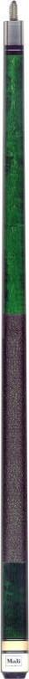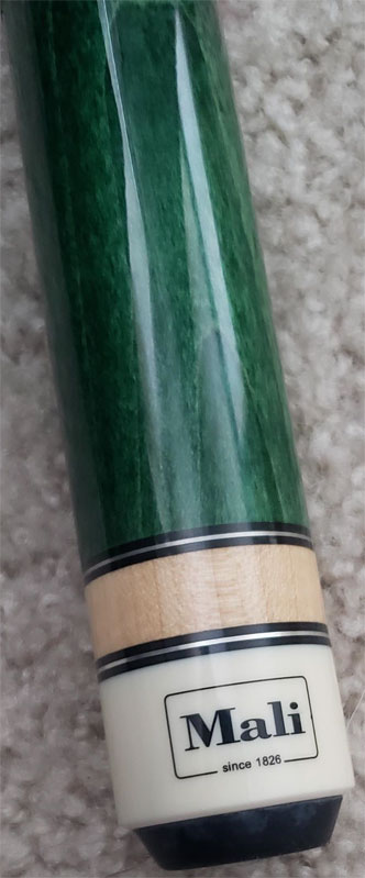 Mali pool cue with a green stained birdseye maple forearm. The butt is green stained birdseye maple with a wide natural stained birdseye maple ring surrounded by nickel silver rings. The wrap is black with green spec Irish linen. There are two sets of nickel silver rings at the joint. The joint is stainless steel with 5/16 x 14 piloted pin. This cue comes with one shaft with a 13 mm pro taper and Le Pro tip. The quality of the finish and linen wrap on the Mali Cues are exceptional!
