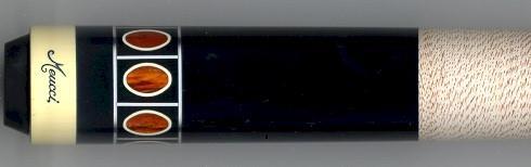Meucci pool cue with a stained Birdseye maple forearm with four ebony points with two veneers and blood wood ovals surrounded by ivorine in the points. The butt is ebony with blood wood ovals inside of ebony boxes. There are two sets of thick blood wood rings. The wrap is white with brown spec Irish linen coated in lacquer. The joint is stainless steel with a 5/16 x 18 piloted stainless steel pin. This pool cue comes with your choice of red dot or black dot shaft.