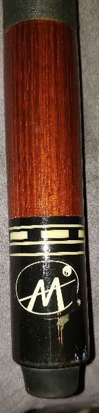 It is a cue with a letter "M" logo. The letter M has a cue through it, and a 7 ball near the top right of it. I'm also looking to know how much it is worth.