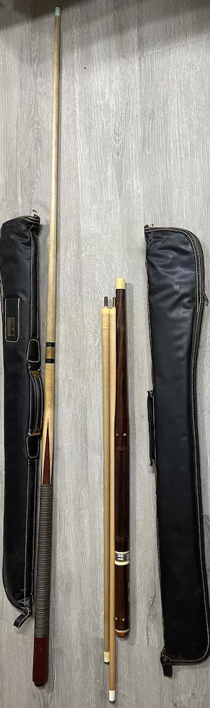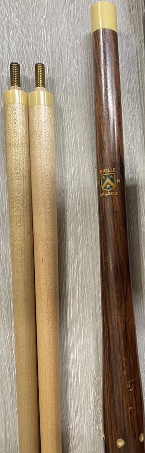 One is a 3-piece Hiolle pool cue, but I am not sure of it's age or it's value.
